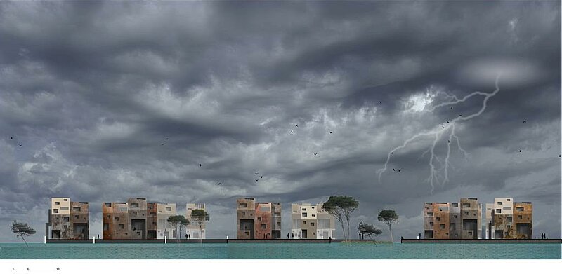The “A Fleur d'eau” project's objective is to learn to inhabit flooded areas by creating a new quarter in the place of the saltmarshes of the Ré Island in Ars-en-Ré a town that connects the North to the South. The quarter will consist of two zones: one where the ponds are fed through a channel and accessible on boats and the other where they stay completely underwater. The quarter will be protected by a new dam inspired by the Vauban fortress and the shape of the Island seen from above.