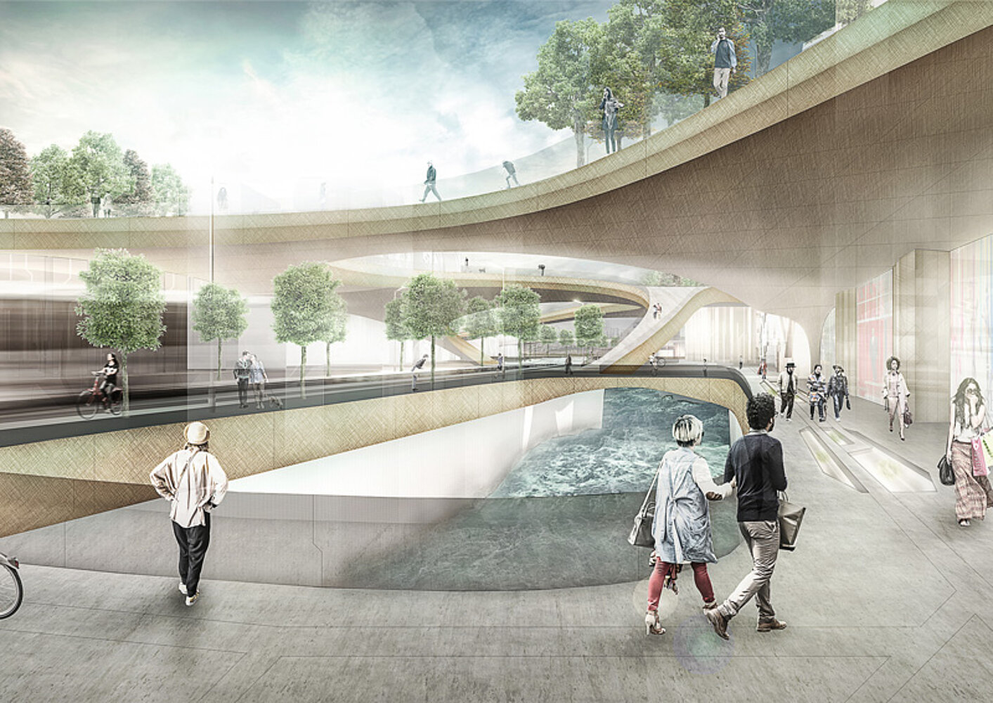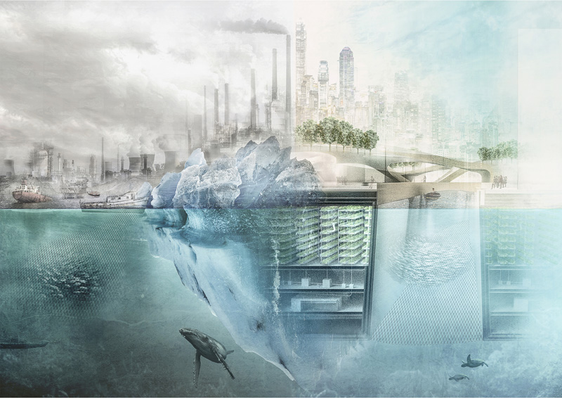 “Adapting infrastructures” is to be seen as a floating urban extension to an existing city such as Amsterdam. A custom-designed tube structure reinvents the infrastructural system as known so far. At least two thirds are underwater, containing the necessary power grid (with electricity produced by solar panels), a heat supply structure as well as several water treatment plants. Big parts are used for vertical farming, food production and a new form of food distribution. Crops are harvested and food is produced when previously ordered. Robots deliver the products to each apartment using pipelines right below the streets. The street level is used for faster transportation. Trams are solely riding on the main tubes, able, while cyclists can move freely on all streets. At this level, the buildings accommodate business, retail and cultural facilities, making this platform the urban center of the city. Using ramps, the inhabitants can switch to another level situated above. This pedestrian area generates a calm environment for the housing districts/residential spaces. Each block has an inner green courtyard, interconnected to the other courtyards as well as larger city parks. Therefore it is possible to move through the city by walking on a man-made landscape.