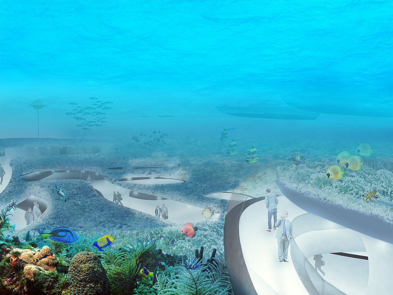 The structure is designed as a series of interlocking closed loop systems, where waste from one system provides food for the next. For instance, exhaled carbon dioxide from aquanauts is harvested by a microalgae system and returned as a fresh oxygen supply. Human waste also feeds this system, and the biomass produced as the algae grow is used to feed fish in floating fish farms, providing the seafood expected by super-rich tax evaders. Their payment funds the mineral accretion technology that is used to accelerate coral build up over the structure's surface. This technology works by attracting layers of corallite skeletal build up; combining the natural geometric strength of inflated forms with the material strength of limestone. It has two major benefits: coral reefs can withstand higher sea temperatures and ever-increasing ocean acidification. Internally the building acts like a resort, complete with bar, restaurant, casino, private submarine hire and diving facilities. The visuals demonstrate the coral reef growth over several decades.