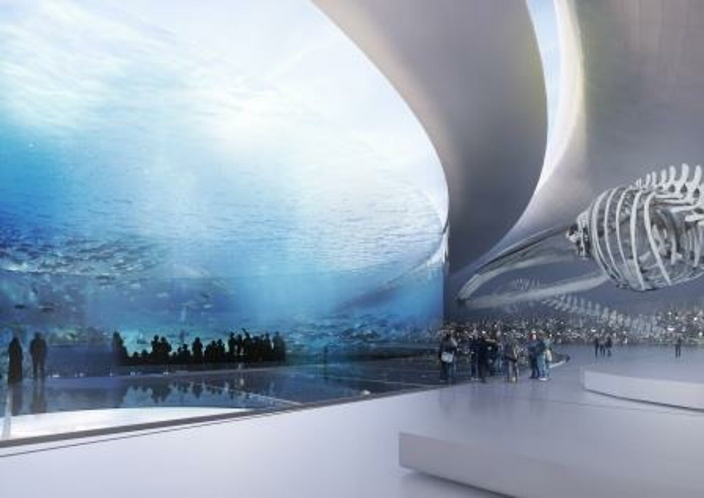 The trip is ending with an exhibit on the protection of our oceans. The project is supported by a floating platform with three levels. A tubular structure is suspended to this platform acting as a growth support for all the marine organisms, including corals. The submarine tunnel is enrolling like a vortex through different marine worlds of our oceans. Firstly the surface waters present big mammals like whales or dolphins and visitors can discover the world of coral reef with all its different coral forms and colored fishes. Finally, diving into the blue and yet unknown abyssal word leads us to discover creatures of another time.
