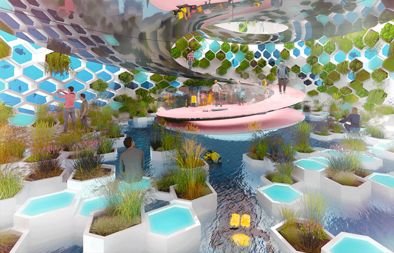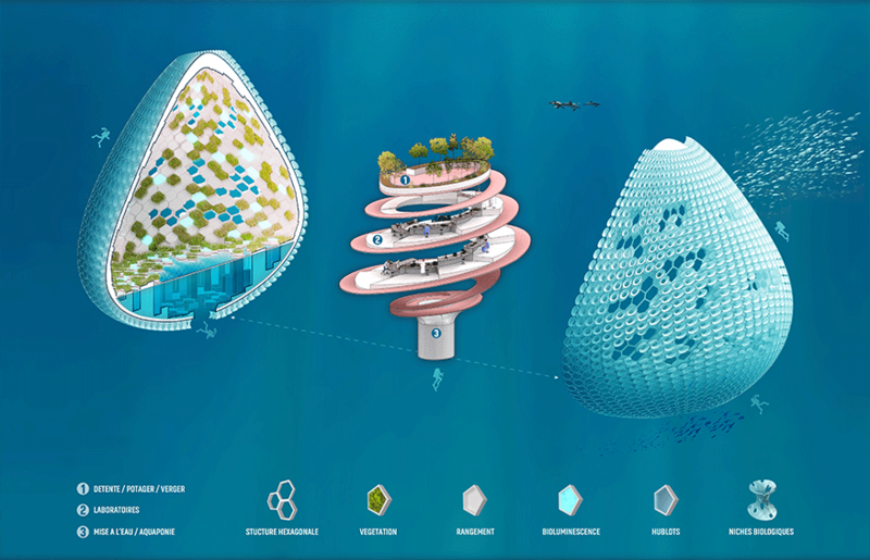 Do you know how to promote biodiversity and marine ecosystems? Contribute to a better knowledge of the seas? Put an end to multiple pollution? Floating Reef, printed in 3D with a biogenic material that recycles plastic, is an ecological mooring that preserves the seabed and regenerates biodiversity. Floating Reef, of biomimetic design, promotes knowledge and its sharing. Floating Reef, allowing an autonomous human life within it, offers wave energy and gray and black water treatment to small boaters as well as supertankers at anchor.