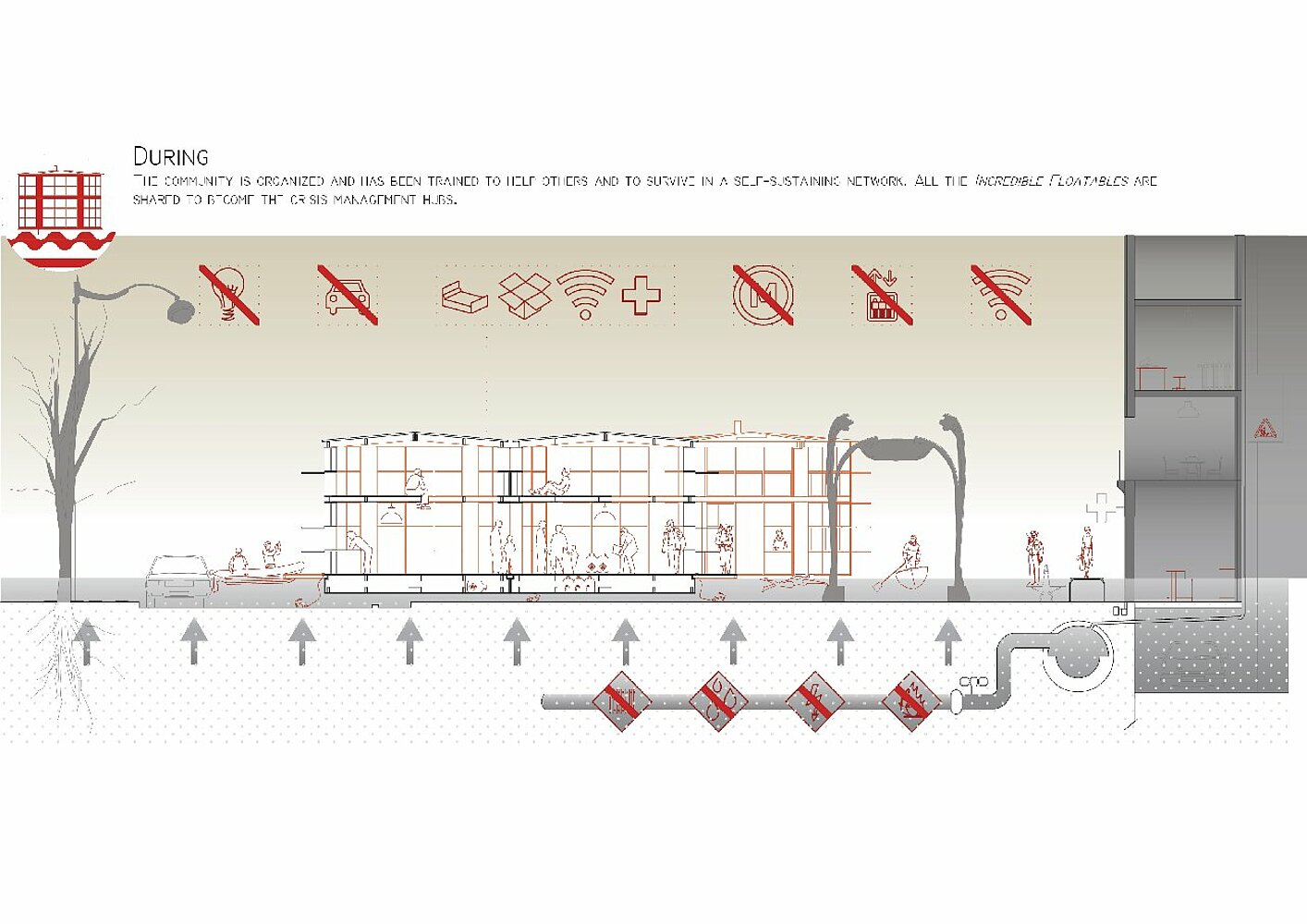 - After the flood, the Incredible Floatables are support centers for information and services and material supplies for reconstruction. They are the main actors for resilience.