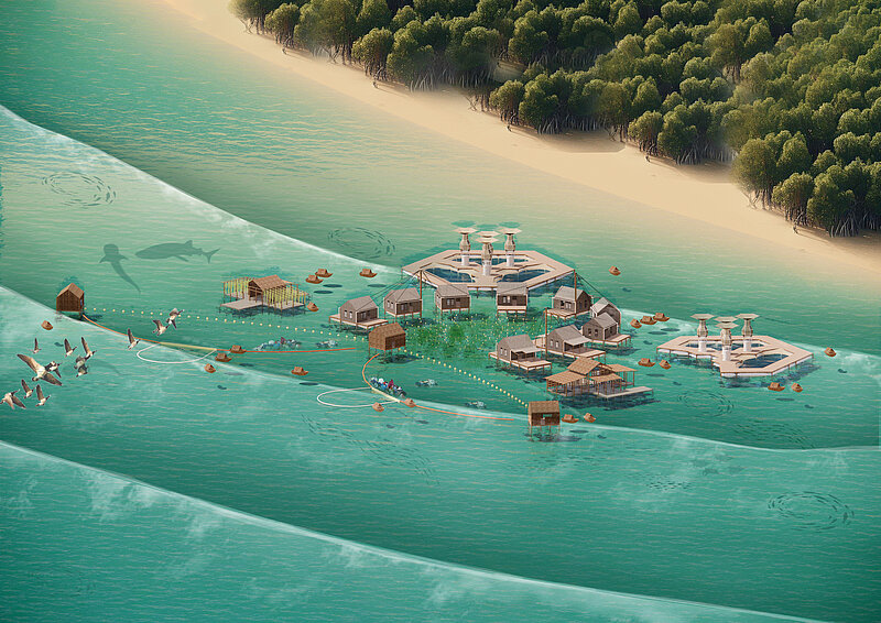 Littoral Biomimicry" is a revitalization project of the Tajur Biru coastal village. It embodies a resilient apparatus adopted from the morphology and physiology of intertidal creatures. Through this natural assimilation, it is possible to preserve the indigeneity of their stilted housings while reinforcing their structure using lateral suspensions, creating dynamic architecture that floats through the rising tides, and even creating sustainable systems for freshwater and biodiversity through ocean farms and cloud harvesting.