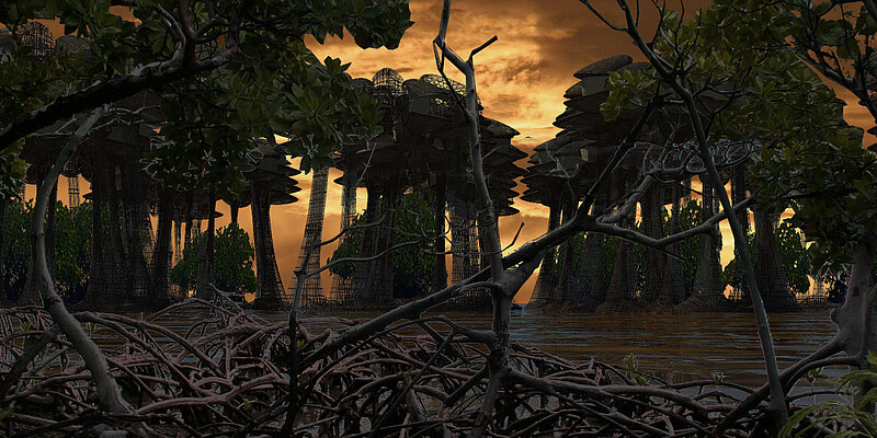 Indeed it is to create housing on modules for large-scale water to protect existing forests and on a smaller scale, allow the spread of mangroves. The goal is that each residential group care of ” the forest .” These are permanent structures that are gradually invaded by the plant . It is a noble and precarious architecture that can adapt to many areas where the mangrove is or was previously located.