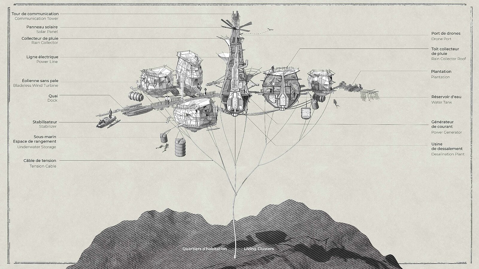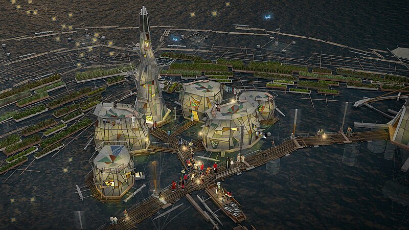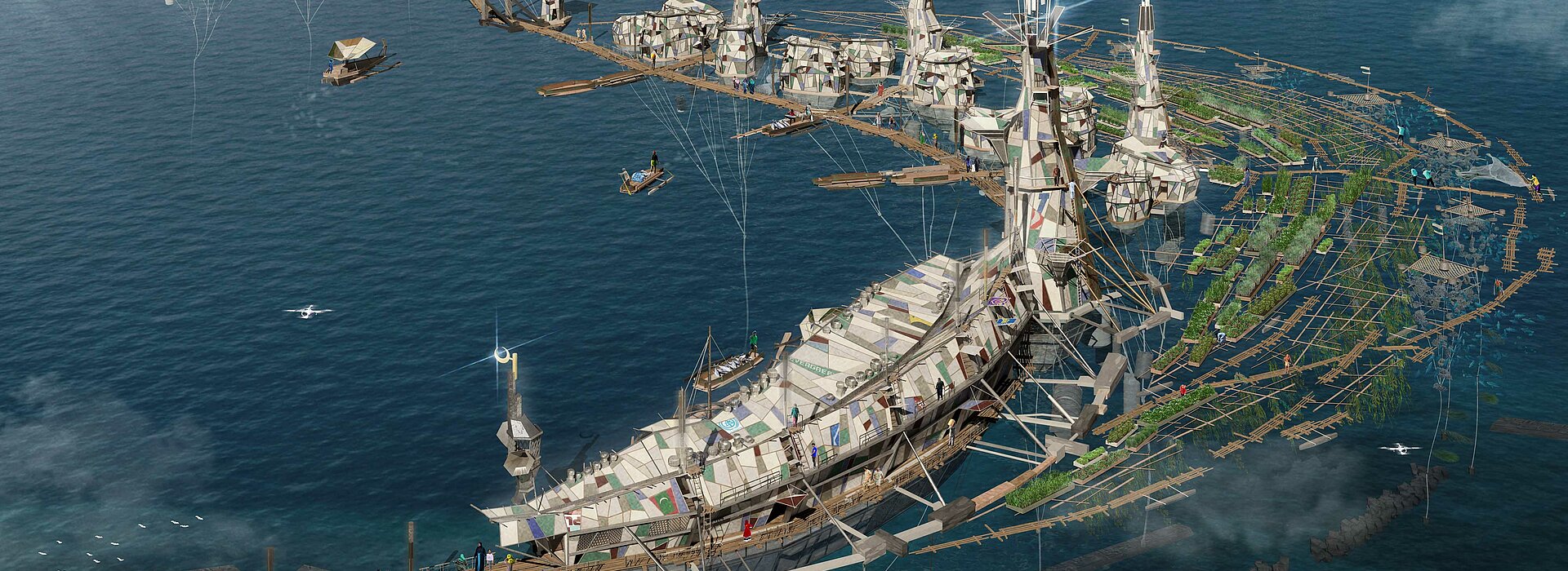 Maldivians resettle on strings of interconnected watercrafts. A crescent formation reach out to share produces of food & energy with nearest habitats.