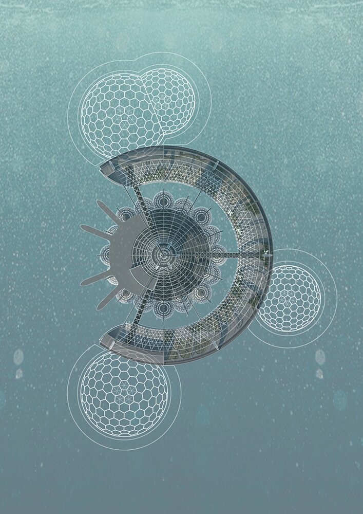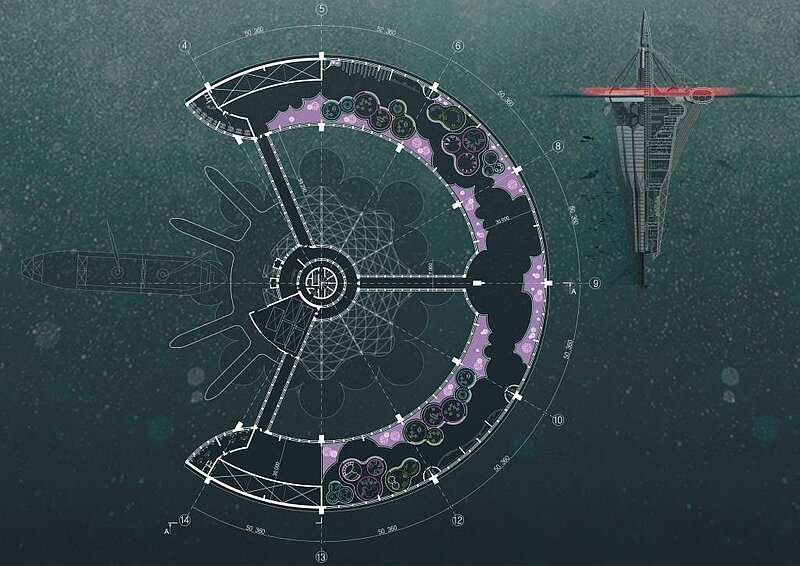 The complex is fully Autonomous from the engineering point of view. Environmentally clean project. Provided intake system, desalination and disinfection of sea water, further treatment and reuse. Waste is recycled and transported to the greenhouse as fertilizer. The complex is equipped with an independent power. Also developed systems of alternative energy generation such as wind turbines, generators, underwater currents and the generators of a temperature difference.