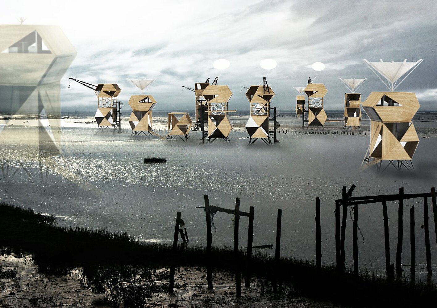 The project approach is involved in finding objects in hostile territory. The project began by drawing a collection of 51 objects of particular interest to the problem of rising sea levels. Port and spatial architectures found their importance thanks to their robust features, their detachment from the ground, their adaptability and evolution.