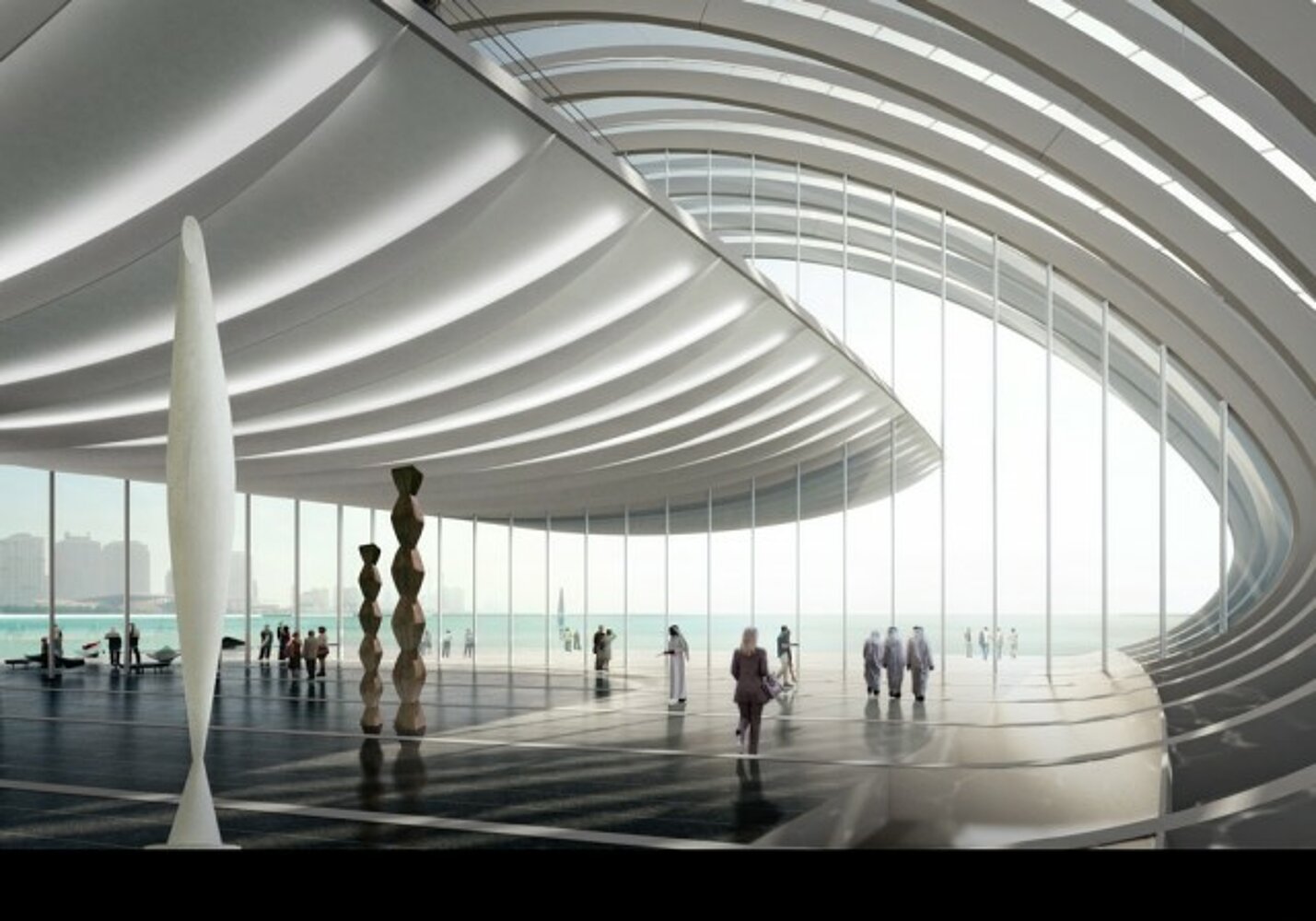 The building's transparent shell appears as if it floats on the sea, both inviting and mysterious. The interior is a magnificent spiralled space, directed towards Qetayfan Island and offering panoramic views on Lusail City and Doha coastline. The glittering sunlight on the sea gives the space its poetic vibration.