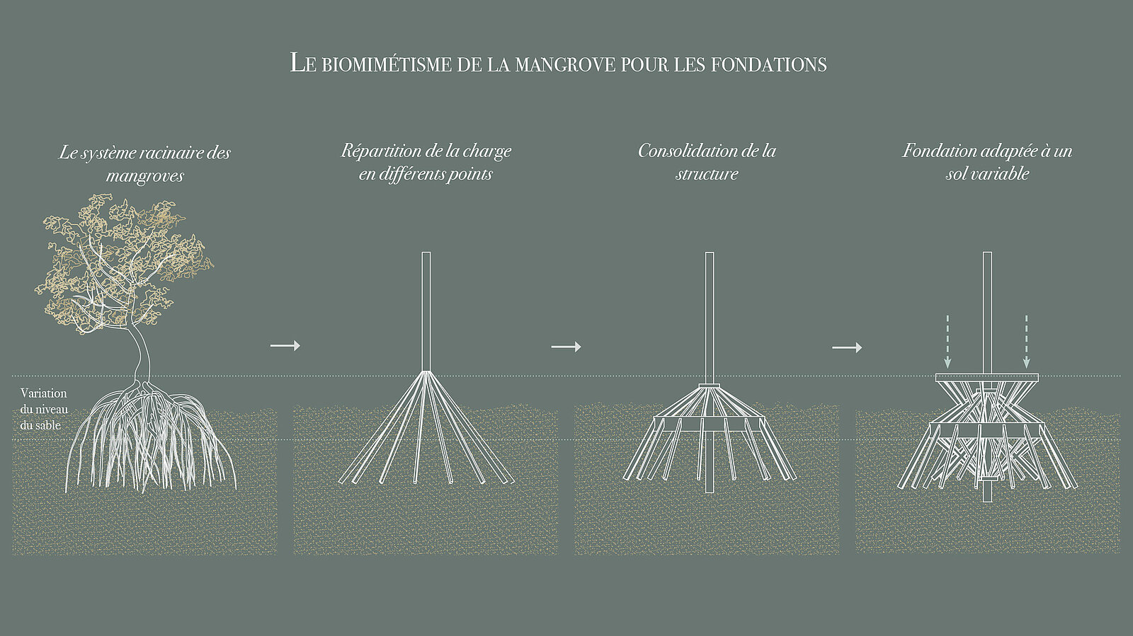 Totope, a fishing village, is suffering from coastal erosion and sea level rise. We offer a realistic solution to establishing a resilient village. Foundations inspired by mangrove roots are used to strengthen the structure. The design focuses on the local residents and their work, it seeks to maintain Totope's sustainability and use of the land until it sinks. To achieve the process, the project uses natural hydraulic forces that gradually elevate the structure by adapting it to sea level. Thus, it faces climate change while preserving the local lifestyle.