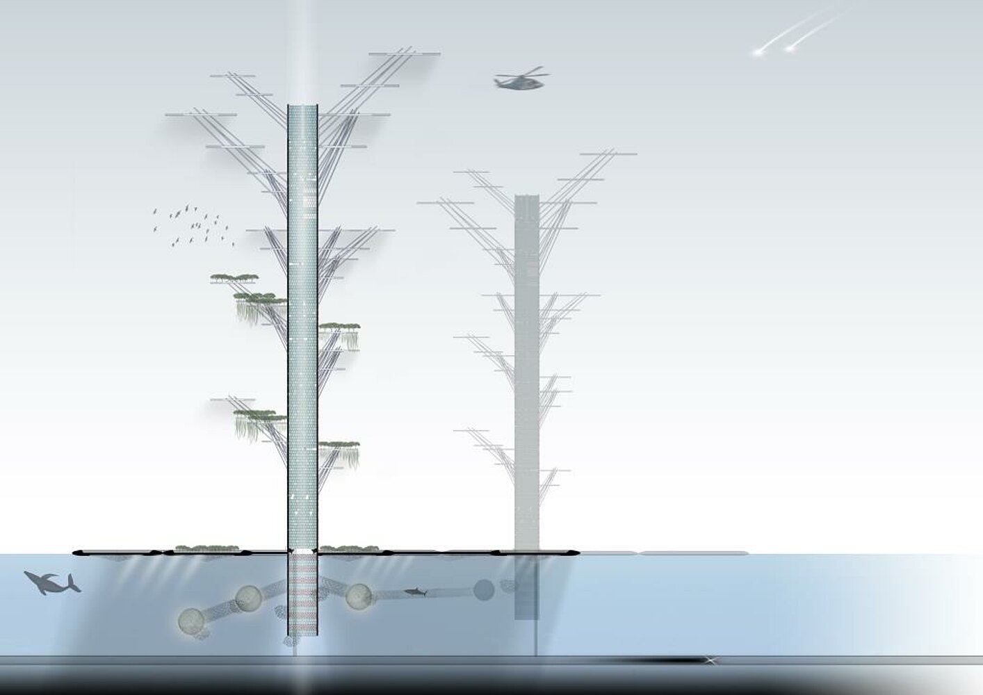 In this future setting, energy will be fully sourced from sustainable energy like wave, thermal, solar and fusion. Transportation will be extremely accessible and affordable whereby the technology will be based on hovering and magnetism. Food will be farm directly from the heart of the city whereby food can be obtained from land and sea, vegetable or meat. With the proximity to the consumers and transparency of the food production, it will save up a lot of costing compared to the current food industry. Besides, building material will be revolutionized into reusable Nano-Carbon to ensure zero waste.
