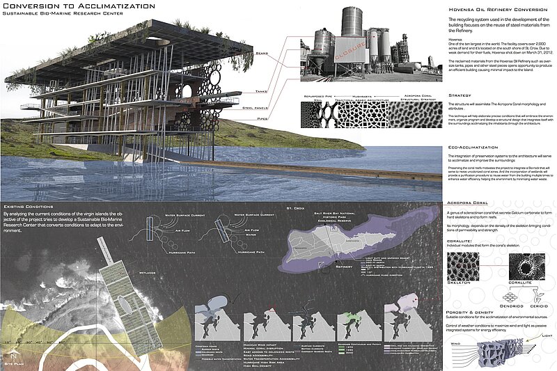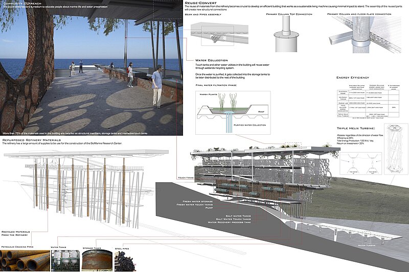The current conditions of the Virgin Islands have very specific objectives to preserve its integrity. By analyzing these conditions the main objective of the project tries to develop the construction of a Bio-Marine research Center that converts conditions to adapt to the environment. The reuse of materials from the refinery becomes crucial to develop an efficient building that works as a sustainable living machine causing minimal impact to island. The preservation of the coral reefs motivates the project to integrate a Bio-rock that will serve to revive uncolonized coral zones. The efficient usage of water and energy is crucial as part of the architecture as well as using methods to contribute to the maximum control of the environment for survival without the need of energy usage. One of the approaches for better efficiency is through recycling methods. The incorporation of wetlands will provide a purification procedure to reuse water from the building multiple times to enhance water efficiency, helping the environment by minimizing water waste.