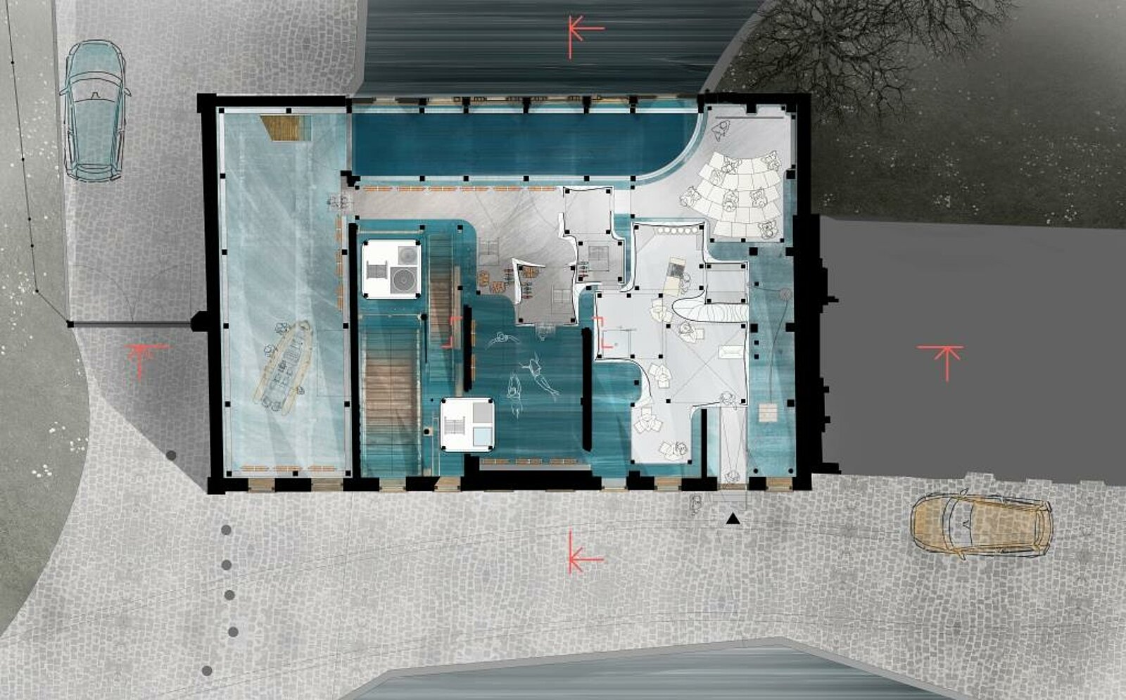 The project is talking not just about the rising sea level problems, but also about how to adapt the existing architecture heritage to survive the changing climate, and how, perhaps, nowadays unused buildings could start to have a completely new purposes, such as training local communities for flood situations, and being important centres for emergency storages when the floods occur and city cannot fight against it anymore and has to adapt to the aquatic life.