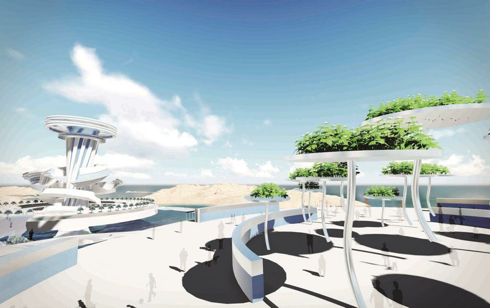 In the group, this is a self sustainable development of marine habitats, which can provide a long-term life for human, animal and plant location. The concept is by a centrosome and several affiliated monomer through the corridor connected, centrosome mainly provides a human living space, affiliated monomer, as residents of the community social activity place, the were set up schools, hospitals, parks, shopping malls, restaurants and other public facilities; top through the erection of solar panels for the normal life of the community to provide energy support, while the installation of rainwater collection system, provide water resources for platform of plants and human activities.