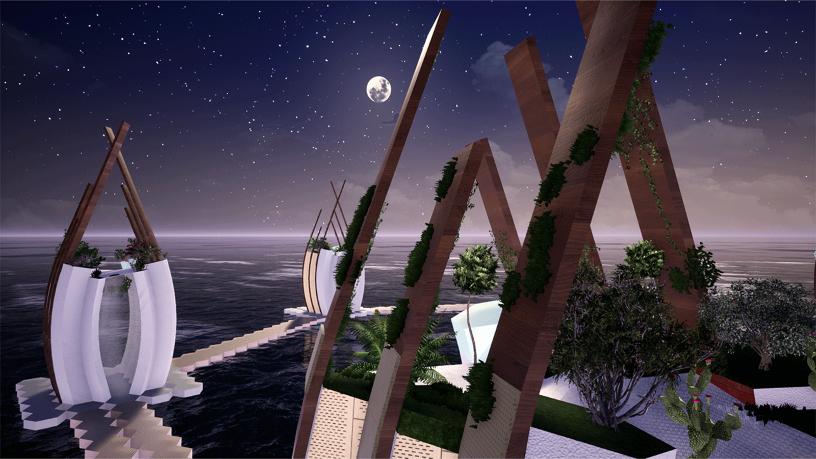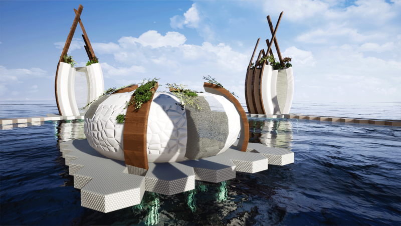 TOPOSA is inspired by the traditional African shelter for its function of protection against nature and its composition in huts, hexagons that contain flexible and multi-functional cells. The fluid shape adapts to wind and weather, moreover all the materials used which have corne from recycled plastics and wood. The platform is floating with the use of Archimedes' thrust and anchor to ensure the stability of the shelter, so the project is self-sufficient on renewable energy and natural food resources, host to a thriving swarm.